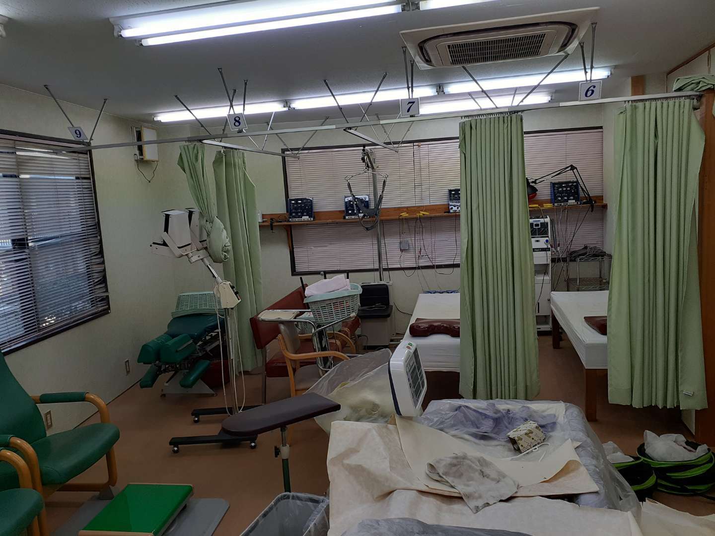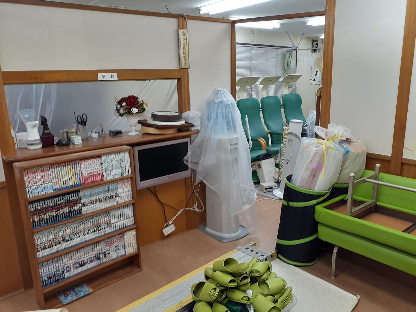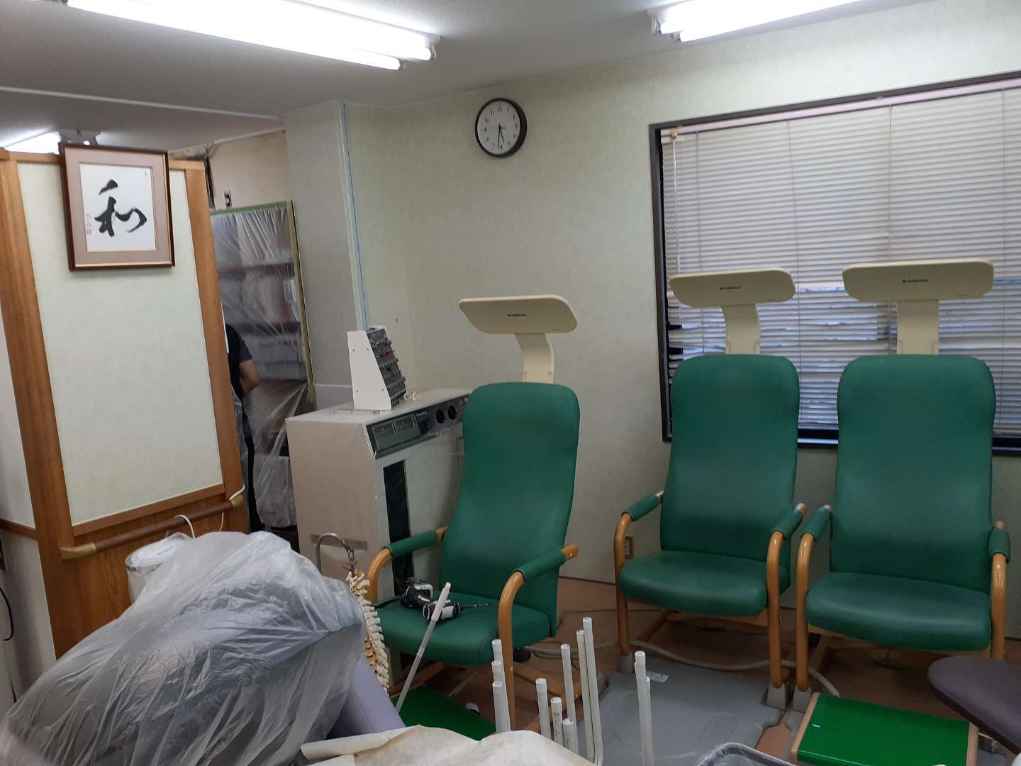 ここの整骨院さんは結構広くて受け付け待合室ゾーンは白いクロスで、左右に施術室が分かれていて右側のグリーンゾーンはグリーンのクロスで左側のピンクゾーンはピンクのクロスで貼ります。