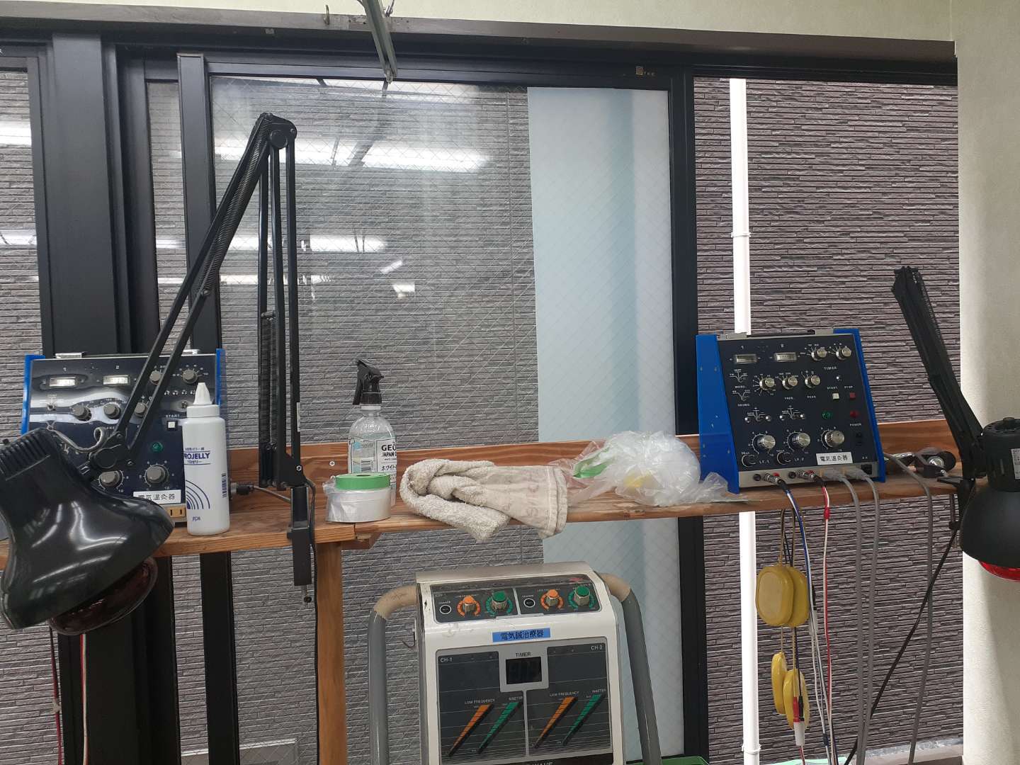 ごらんの通り機材の乗った棚があり、右側のカベは後からの造作で造られていて窓の端は20cmほどカベの向こう側にあって、ちょうどスタッフルームの物入れに窓の端がきます。